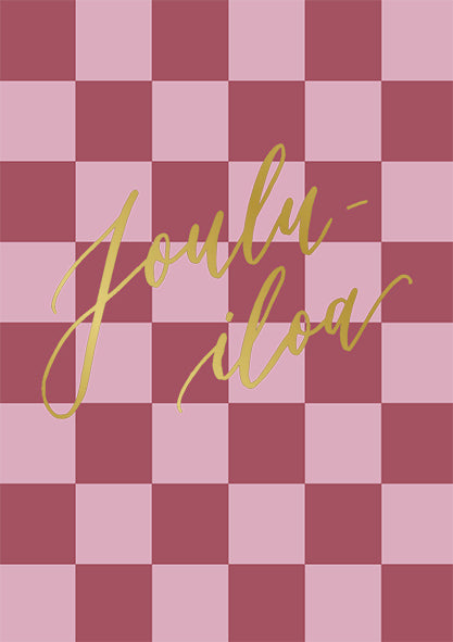 Finnish 2-part Christmas card made of high-quality cardboard. The cover has the gold-foiled text "Jouluiloa", the background is checkered, in burgundy and pink. The card is empty inside and includes a white envelope. Size 105 x 148 mm. Design: Aini Mäensivu / Kalligrafiastudio.