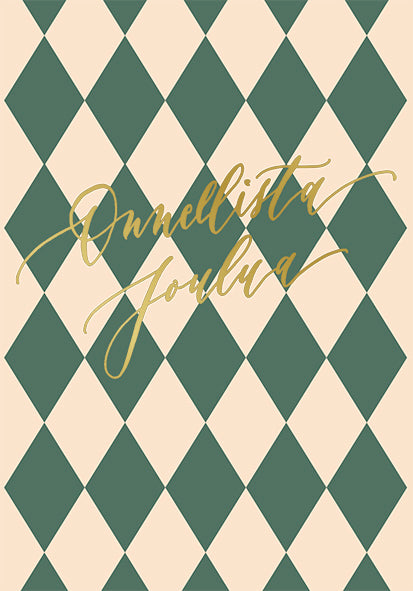 Finnish 2-part Christmas card made of high-quality cardboard. The cover has the gold-foiled text "Onnellista joulua", the background is a checkered pattern, in green and beige. The card is empty inside and includes a white envelope. Size 105 x 148 mm. Design: Aini Mäensivu / Kalligrafiastudio.