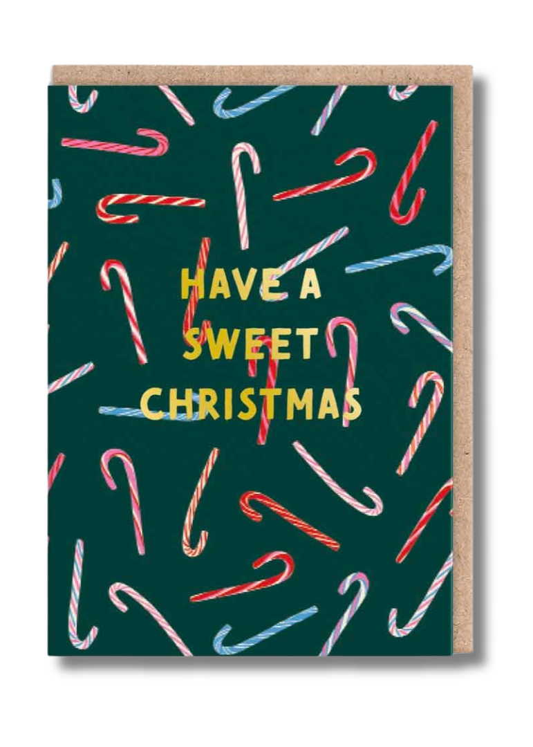 2-part Christmas card. The card has the text "Have a sweet Christmas" on a green background. The picture shows colorful candy canes. Brown envelope. Design: Ohh Deer.