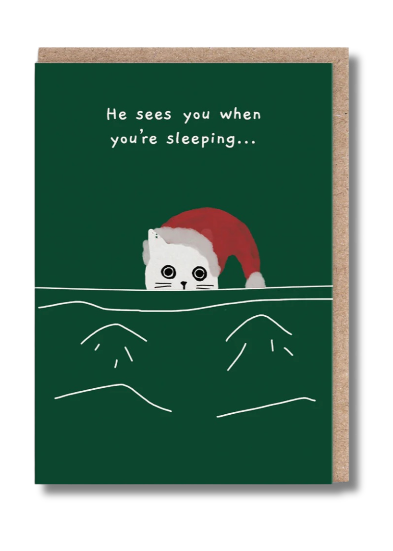 2-part Christmas card. The card has the text "He sees you when you're sleeping..." on a green background. In the picture, the cat is peeking out from under the blanket, the cat is wearing an elf hat. Brown envelope. Design: Ohh Deer.