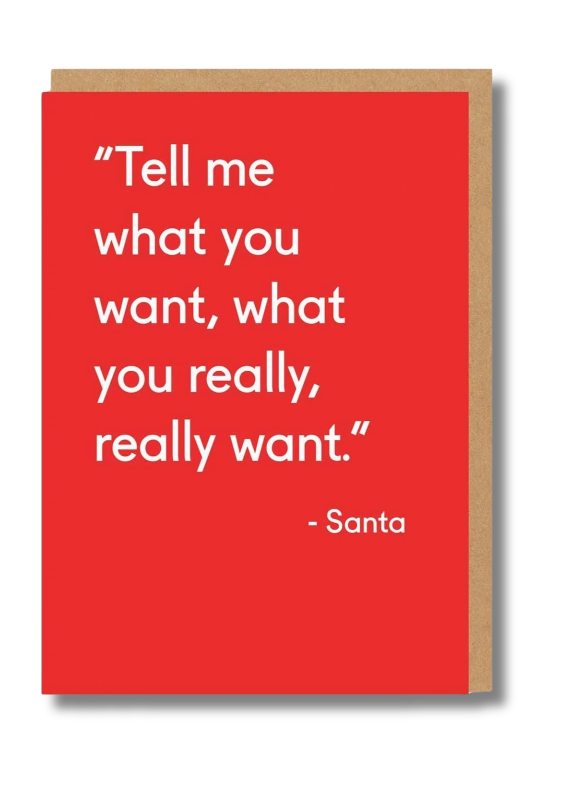 2-part Christmas card. On the card, on a red background, the text "Tell me what you want, what you really, really want." -Sand. Brown envelope. Design: Ohh Deer.