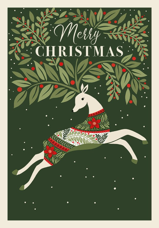 2-part Christmas card made of high-quality cardboard. The image shows a decorative deer on a green leaf-patterned background, and the text "Merry Christmas". The card has gold foil and embossed details, is blank inside and includes a red envelope. Size 105 x 150 mm. Design: The Art File.