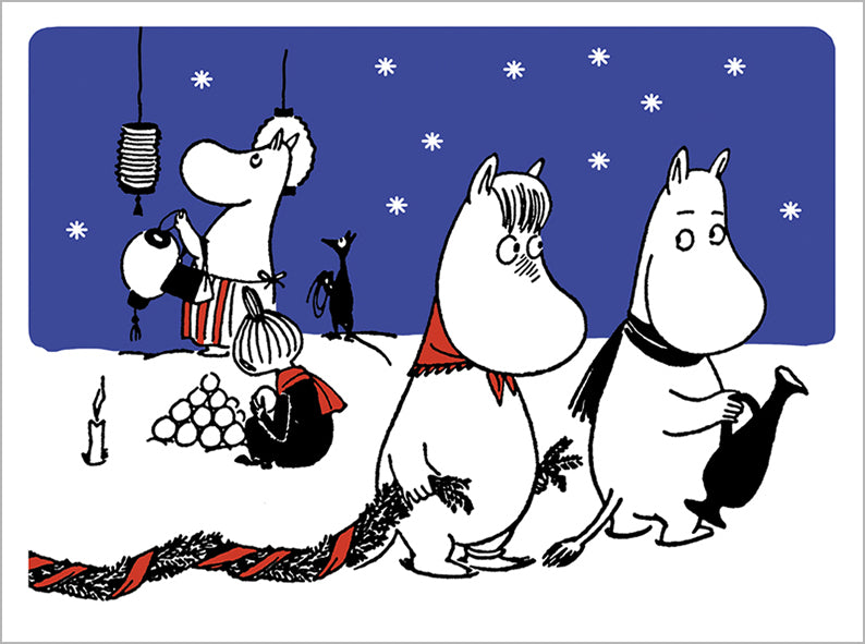 2-part letterpress card. Moomin family outdoors at Christmas. The cards are hand-printed on our own letterpress machines in Arabia, Helsinki. Illustration: Moomin Characters.