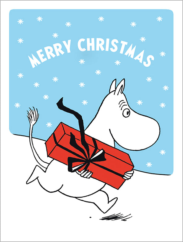 2-part letterpress card. Moomin troll carrying a gift package in a snowy landscape. The cards are hand-printed on our own letterpress machines in Arabia, Helsinki. Illustration: Moomin Characters.