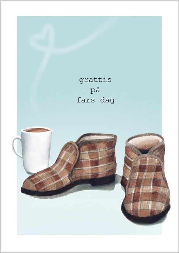 Kotimainen 2-osainen isänpäiväkortti laadukasta kartonkia. Kannessa ruotsinkielinen teksti "Grattis på fars dag", mintun värisellä taustalla kuvassa "Reino-tossut" ja kahvikuppi Kortti on sisältä tyhjä ja sisältää valkoisen kirjekuoren. Koko 105 x 148 mm. Design: Henna Adel.