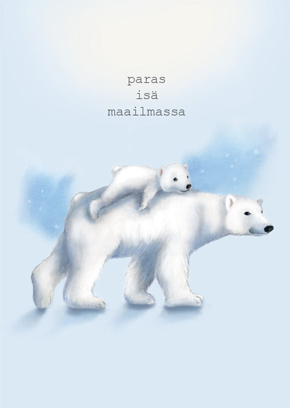 Kotimainen 2-osainen isänpäiväkortti laadukasta kartonkia. Kannen kuvassa iso jääkarhu kantaa selässään jääkarhun pentua sekä teksti "Paras isä maailmassa". Kortti on sisältä tyhjä ja sisältää valkoisen kirjekuoren. Koko 105 x 148 mm. Design: Henna Adel.