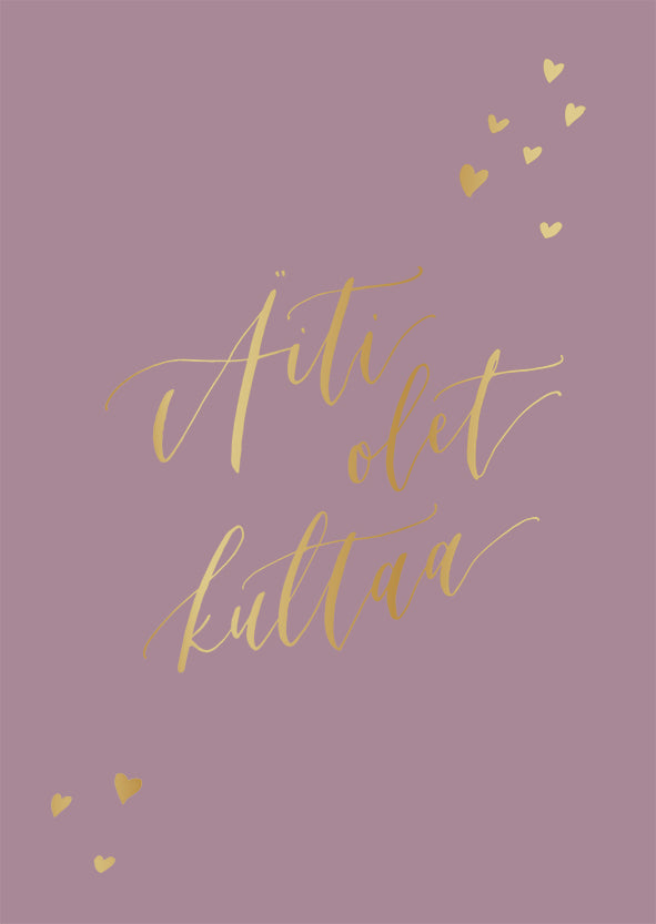 Domestic 2-part card, high-quality cardboard, includes an envelope. Text "Mother you are gold" on the cover, empty inside. Gold foiled details on the card. Size 105 x 148 mm. Design: Aini Mäensivu // Calligraphy studio. Printed in Finland.
