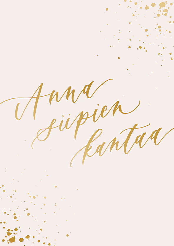Domestic 2-part card, high-quality cardboard, includes a white envelope. On the cover the text "Let the wings fly", empty inside. Gold foiled details on the card. Size 105 x 148 mm. Design: Aini Mäensivu // Calligraphy studio. Printed in Finland.