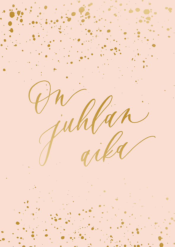 Domestic 2-part card, high-quality cardboard, includes a white envelope. Text "It's time to celebrate" on the cover, empty inside. Gold foiled details on the card. Size 105 x 148 mm. Design: Aini Mäensivu // Calligraphy studio. Printed in Finland.