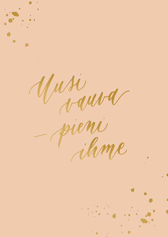 Domestic 2-part card, high-quality cardboard, includes an envelope. Text "New baby little miracle" on the cover, empty inside. Gold foiled details. Size 105 x 148mm. Design: Aini Mäensivu // Calligraphy studio. Made in Finland.