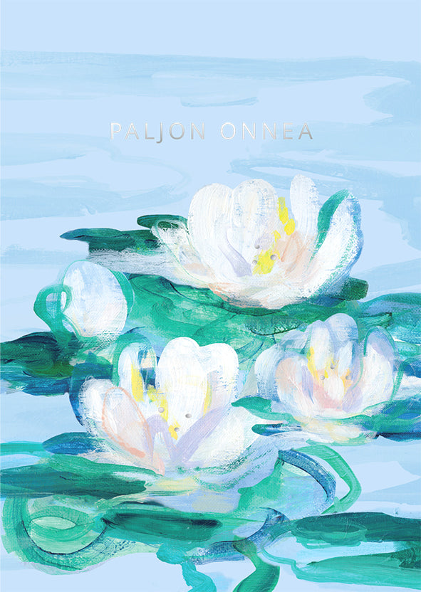 Domestic 2-part card made of high-quality cardboard. The card has beautiful water lilies in water and a gold foiled text: "Congratulations". No text inside. Size: 105 x 148 mm. Includes an envelope. Illustration: Pentik