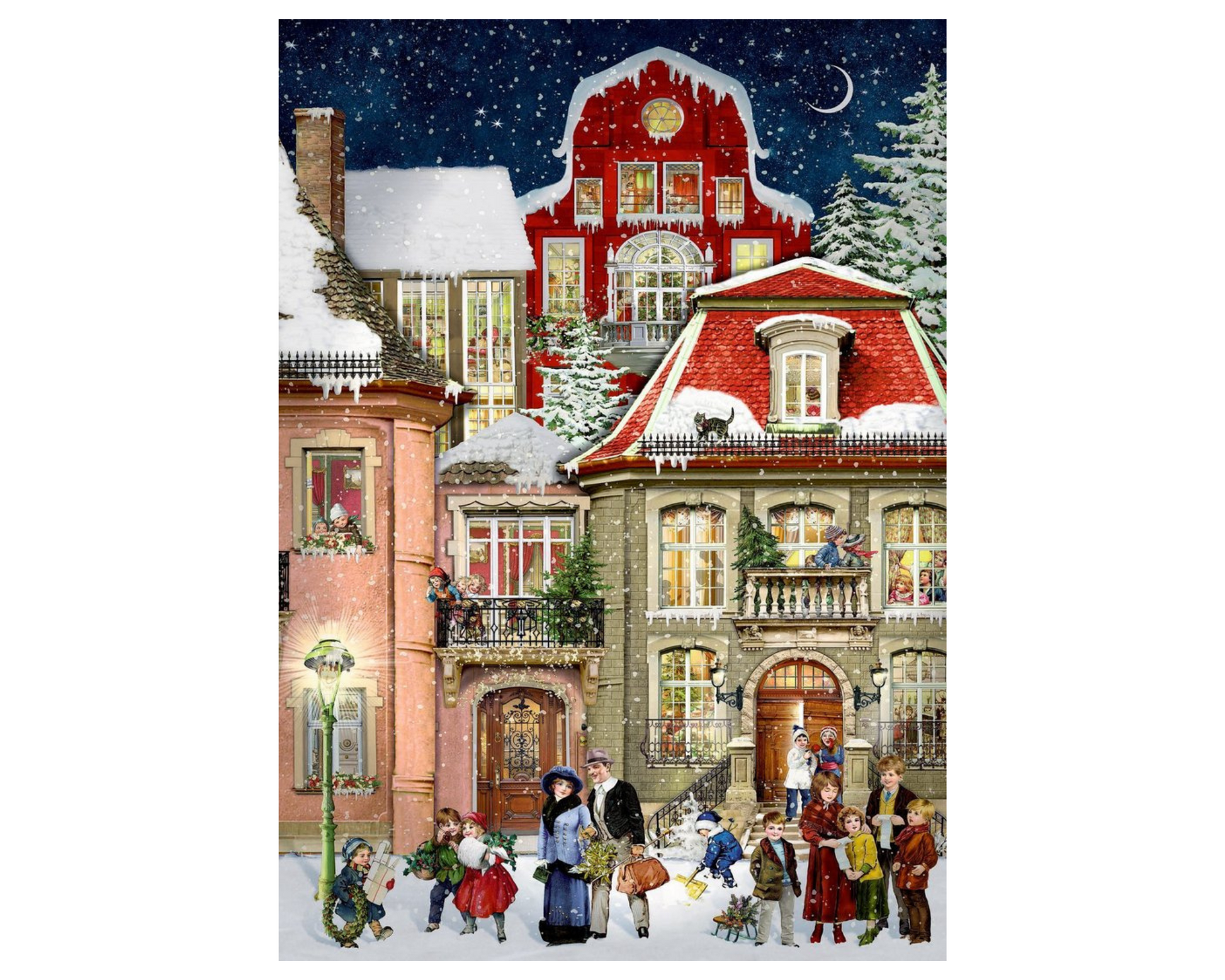 A traditional and nostalgic German Advent calendar in A4 size. The atmospheric picture of this Christmas calendar creates a traditional Christmas atmosphere and has glittered details. 24 doors, behind which Christmas things appear.
