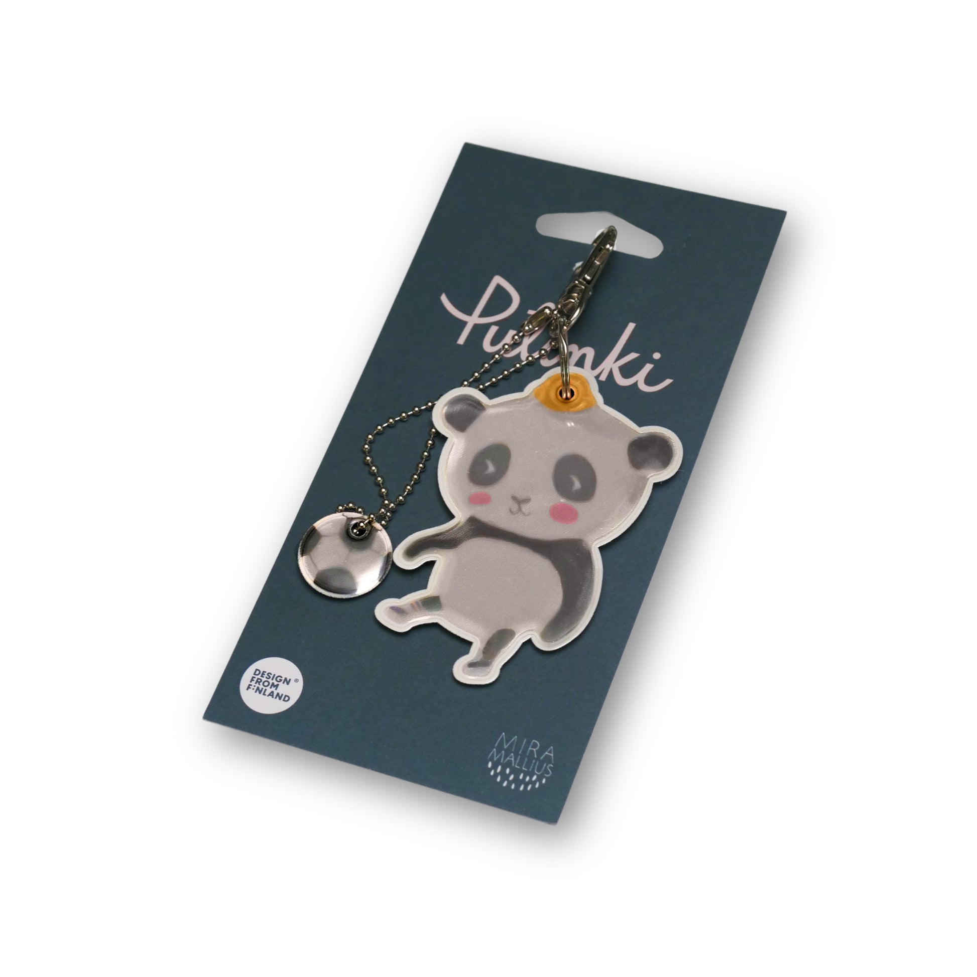 Finnish design reflector with a picture of Panda and football. Includes parrot lock and ball chain. The reflector is CE (EN 13356) marked. Type-tested, the reflector complies with the EU Personal Protective Equipment Regulation 2016/425. Contains small parts, not suitable for children under 3 years old. Size: 8 x 7.5 cm. Ball chain: 7 cm. Design: Mira Mallius. Made in Finland.