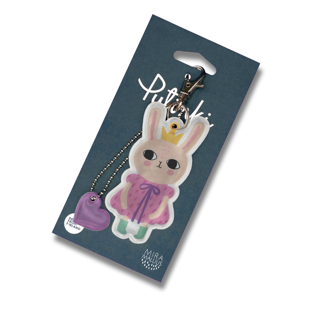 Finnish design reflector, featuring a bunny with a crown on its head and a heart. Includes a parrot clasp and ball chain. The reflector is CE (EN 13356) marked. Type-tested, the reflector complies with the EU Personal Protective Equipment Regulation 2016/425. Contains small parts, not suitable for children under 3 years of age. Size: 7 x 9 cm. Ball chain: 7 cm. Design: Mira Mallius. Made in Finland.