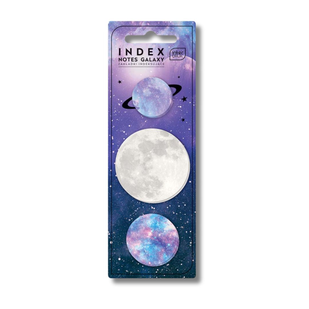Index stickers with a Galaxy theme. The set has three different round notes: two galaxy patterns in blue-purple tones and one full moon. On the reverse side of the sticky note, there is an adhesive surface at the top edge. Beautiful patterned sticky notes can be used to mark the pages of books, calendars and notebooks, and as craft papers.