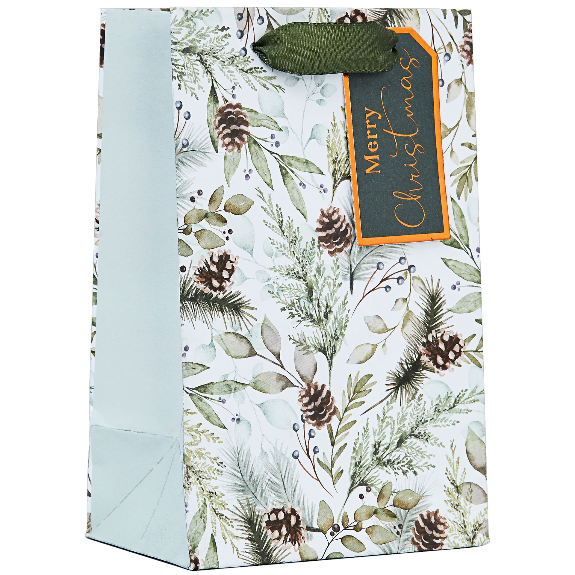 Give your gifts a Christmas atmosphere and a touch of natural beauty with this wonderful gift bag decorated with frosted leaves and cones. Gift bag in size Small. Size 127mm wide. X 203mm high X 90mm deep.