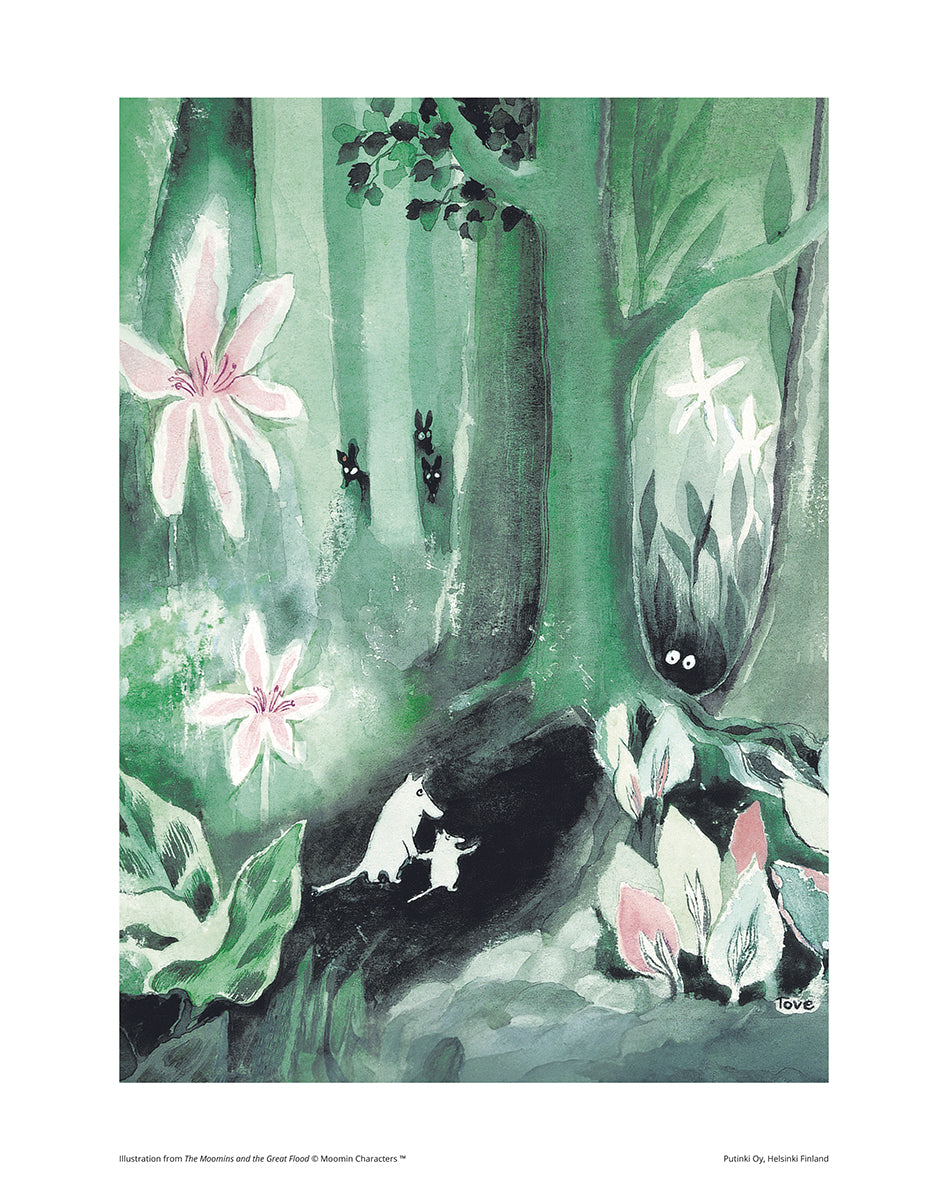 Moomin poster. Size: 24 x 30 cm. In the middle of a green forest, Moomintroll and his mother encounter creatures in the shadows of the trees. Illustration from Tove Jansson's book The Great Flood © Moomin Characters™.