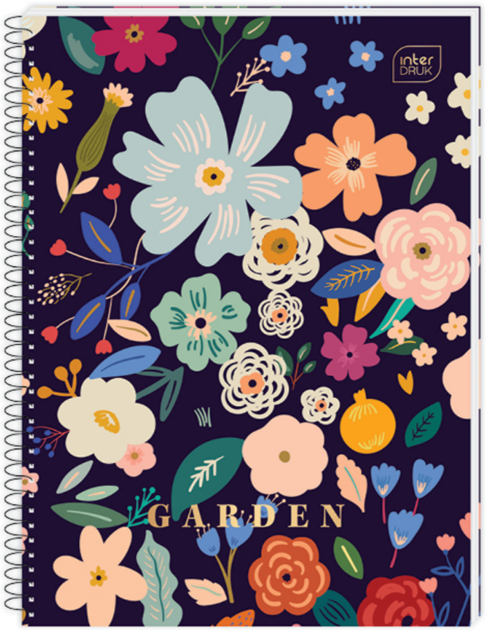 Garden spiral notebook, size A4. The cover features multi-colored drawn flowers on a black background and the text "Garden". Squared pages, 80 pages. Paper on the pages 70 g. Design Interdruk.