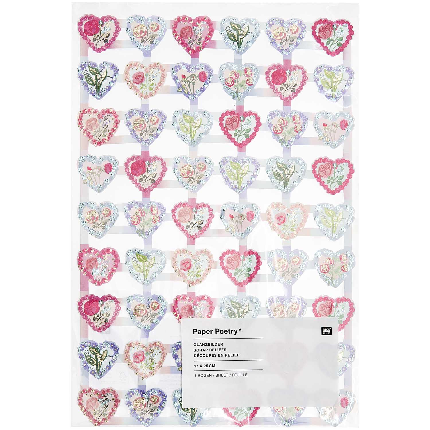 Paper die-cut sheet, 54 pastel colored floral patterned gloss photos. Sheet size 17 x 25 cm. Rico Design, Paper Poetry.