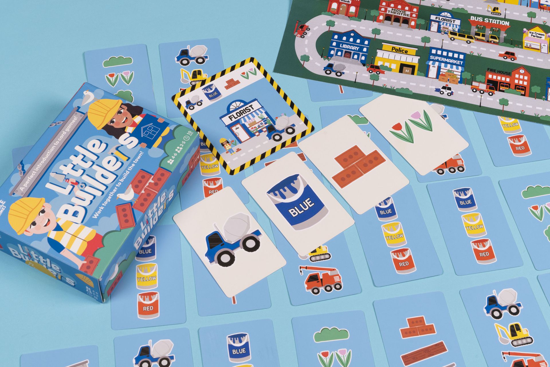Professor Puzzle's Little Builders card game for children. The game includes 32 theme cards, 15 construction cards and a city map poster. Age recommendation for 4-6 years old, 2-5 players. The duration of the game is approx. 10 minutes. Game instructions are in English.