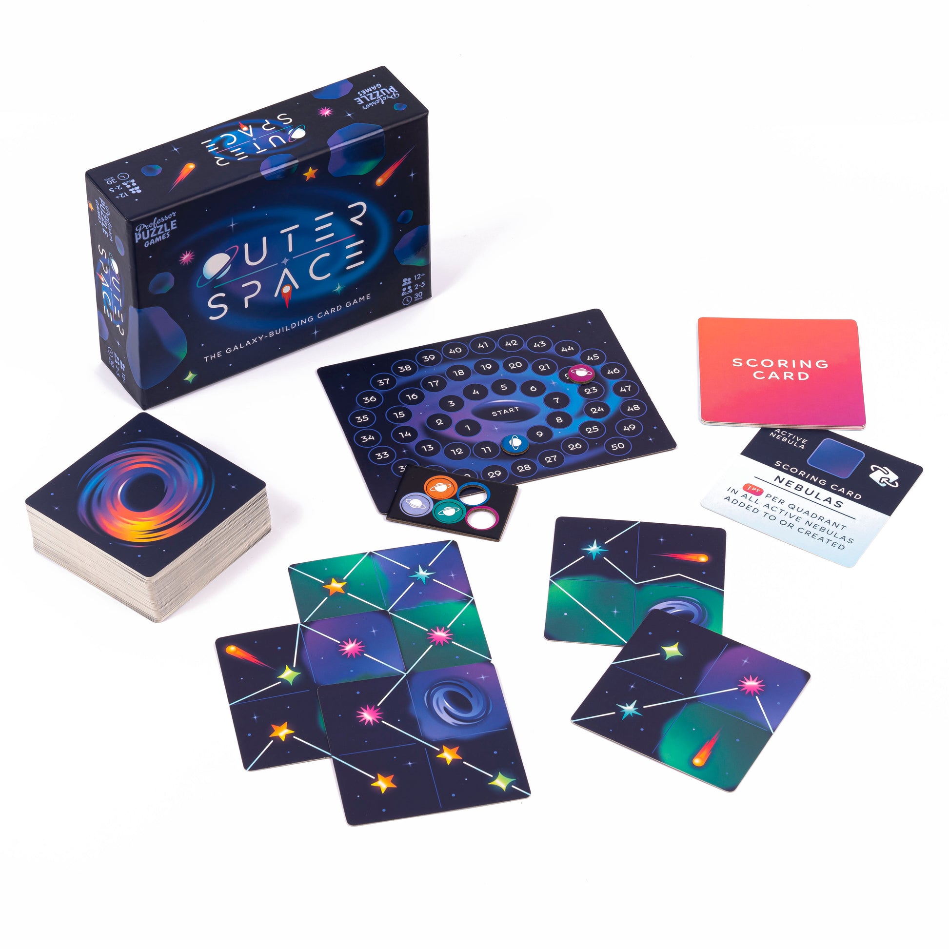 Professor Puzzle's strategy game The Galaxy-building card game. Take turns playing cards and create an ever-expanding galaxy! Strategically place your cards to create giant constellations, massive nebulae, supermassive black holes and more! Can you find the perfect spot on your card to reach an astronomical score?