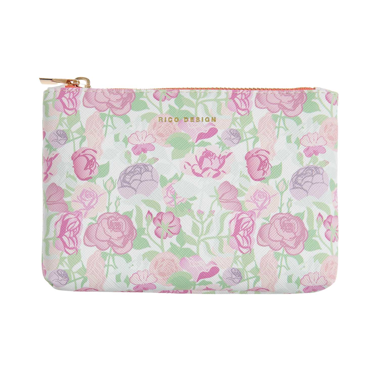 Pouch with pink flowers on a light green background. Size 14 x 10 cm, artificial material, Gold zipper. Rico Design, Paper Poetry.