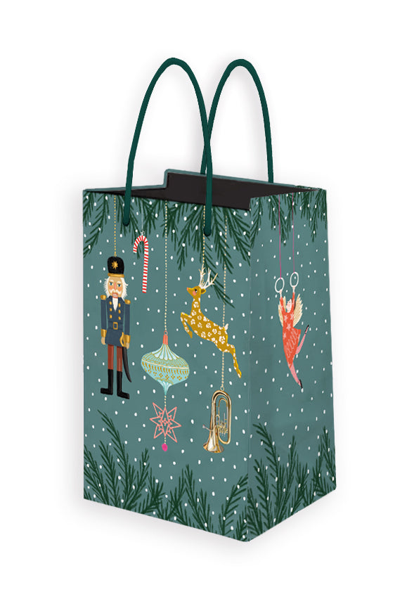 Gift bag made of high-quality thick paper. The bag has cotton handles. Christmas-themed illustration, fir branches and decorations on a green background. Size: width 13 cm, height 20 cm, base 9 cm. Design: Johanna Ilander.