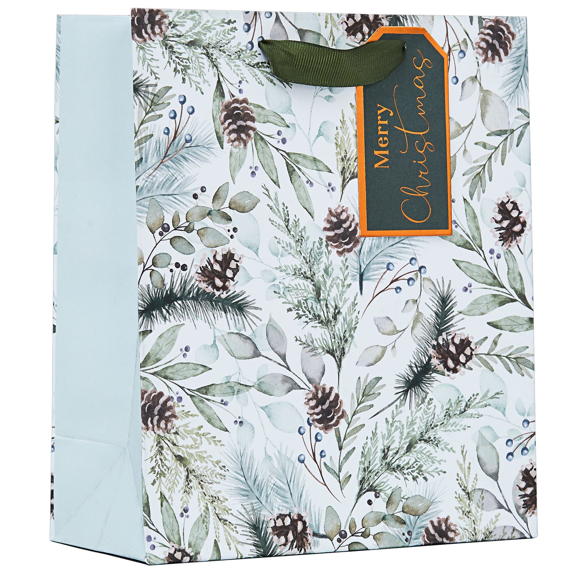 Give your gifts a Christmas atmosphere and a touch of natural beauty with this wonderful gift bag decorated with frosted leaves and cones. Gift bag in size Medium. Size: 215mm wide. X 253mm high. X 102mm deep.