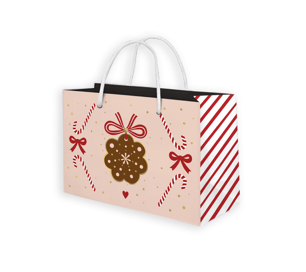 Gift bag made of high-quality thick paper. The bag has cotton handles. Christmas-themed illustration, candy canes and gingerbread on a beige background. Size: width 23 cm, height 17 cm, base 8 cm. Design: Putinki Letters.