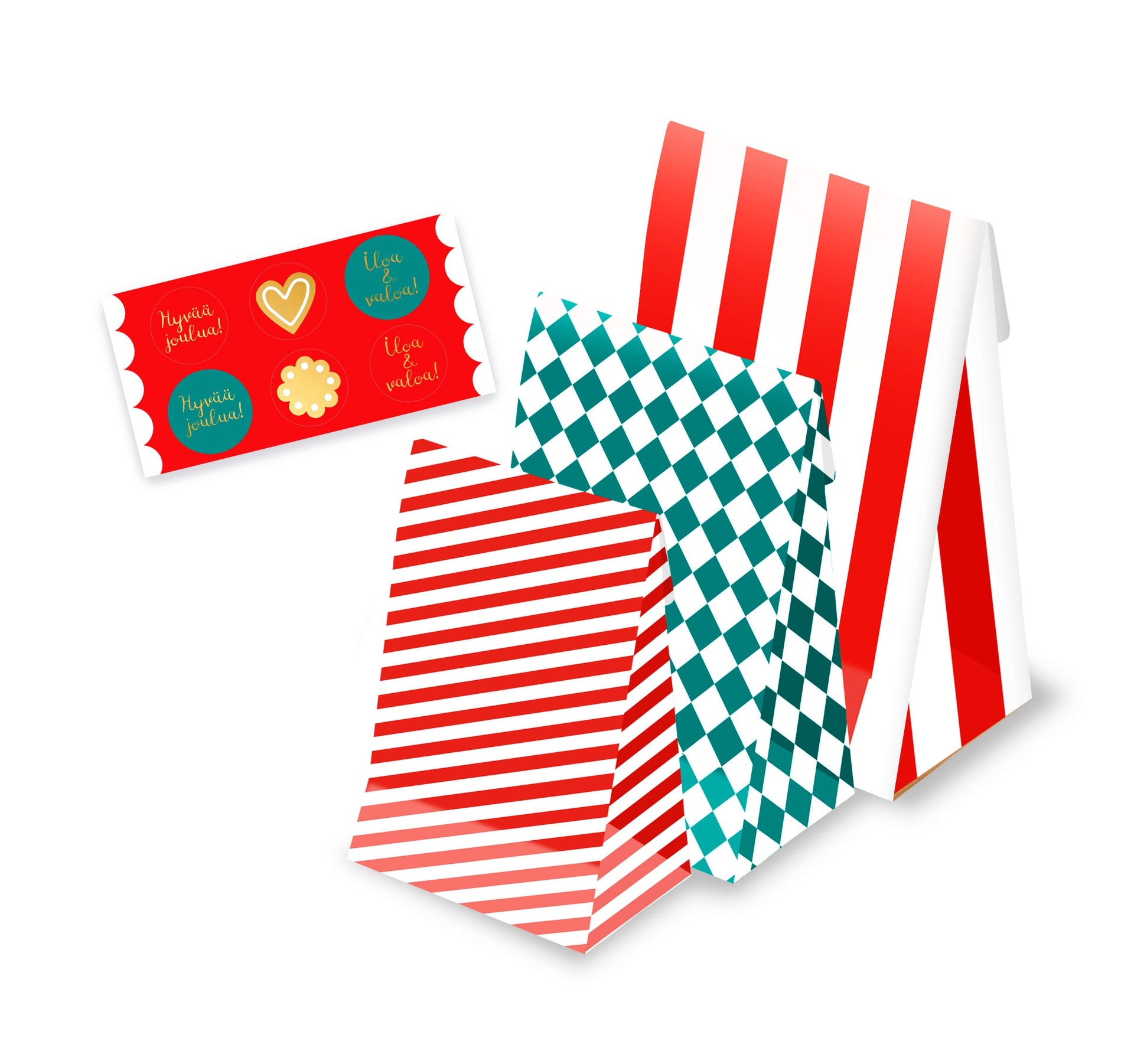 Lahjapussisetti laadukasta paksua paperia. 3 kpl erikokoisia lahjapusseja, puna-valkoraidalliset ja vihreä-valkoruudullinen. Pussien koot ovat 100x160x30 mm, 140x200x30 mm, 65x245x40 mm. Pussin läpässä on tarrakiinnitys. Mukana tarra-arkki, jossa 6 kpl pyöreitä tarroja, Ø 35 mm. Design: Putinki Moments.