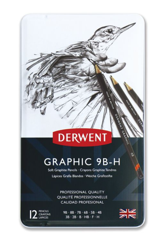 The glossy black wooden barrel with an orange line makes Derwent Graphic pencils classic and easily recognizable. Graphic pencils are a popular choice among graphic artists, architects, designers and illustrators. Ideal for detailed illustration work and drawing compositions. 12-pen Derwent Graphic pencil assortment, 9B-H soft. Hardnesses in the tin box: 9B, 8B, 7B, 6B, 5B, 4B, 3B, 2B, B, HB, F, H.