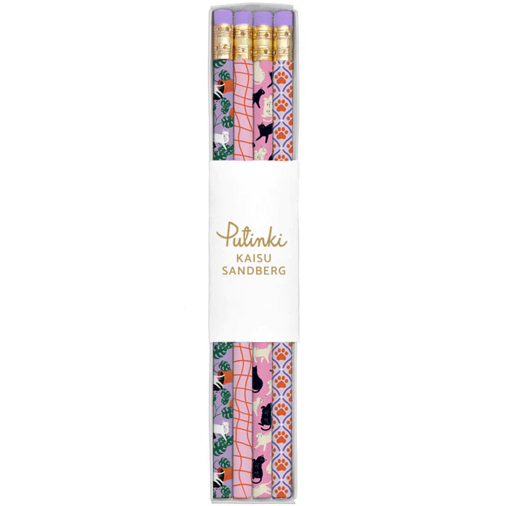 Pencil set Design Kaisu Sandberg, contains four patterned pencils in different pastel shades. The pencils have a matte finish and two pencils have a cat-themed pattern. The pencil has a purple eraser on the end. Pencil length 190 mm, box size 34 x 198 x 17 mm. Design from Finland.