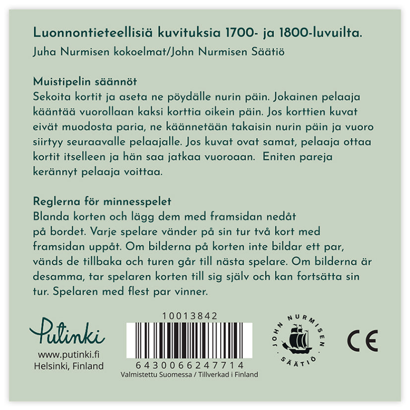 Explore the unique memory game of the John Nurminen Foundation's collections, which takes players on an unforgettable journey to the beauty of nature and history. This memory game contains Natural Science Illustrations from the 18th and 19th centuries, which are both beautiful and educational.