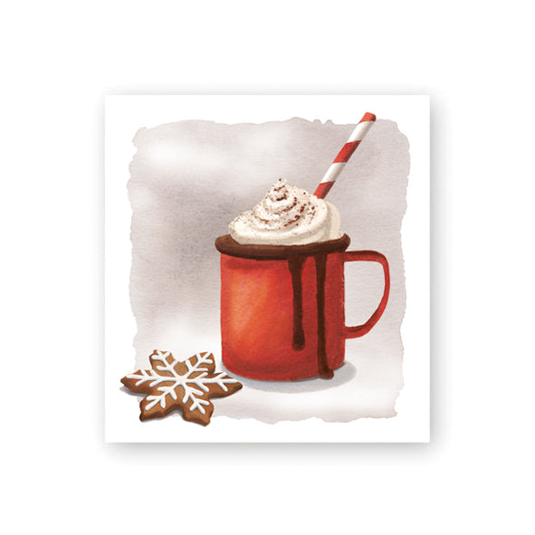 Christmas package card. The picture on the card shows a gingerbread and a mug of cocoa. Empty inside. Size 72 x 77 mm. The back of the card has a hole for a gift string. Design: Henna Adel. Printed in Finland.