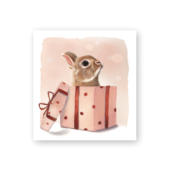 Christmas package card. The picture on the card shows a bunny in a gift package. Empty inside. Size 72 x 77 mm. The back of the card has a hole for a gift string. Design: Henna Adel. Printed in Finland.