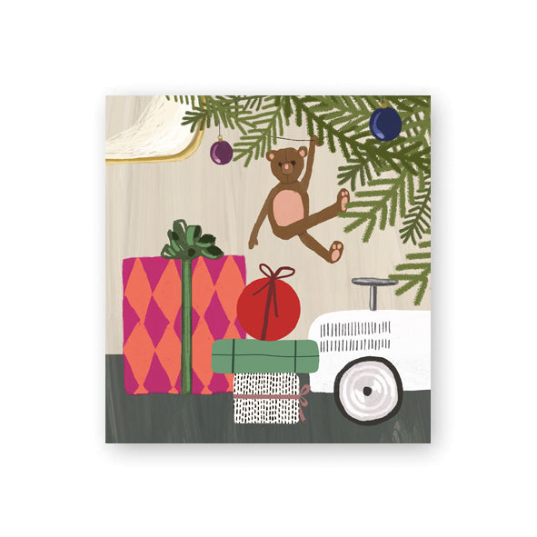 Christmas package card. The picture on the card shows the gift packages under the tree. Empty inside. Size 72 x 77 mm. The back of the card has a hole for a gift string. Design: Johanna Ilander. Printed in Finland.