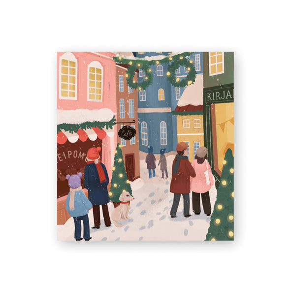 Christmas package card. The card shows a Christmas street with people shopping. Empty inside. Size 72 x 77 mm. There is a hole for a gift string on the back of the card. Design: Kaisu Sandberg. Printed in Finland.
