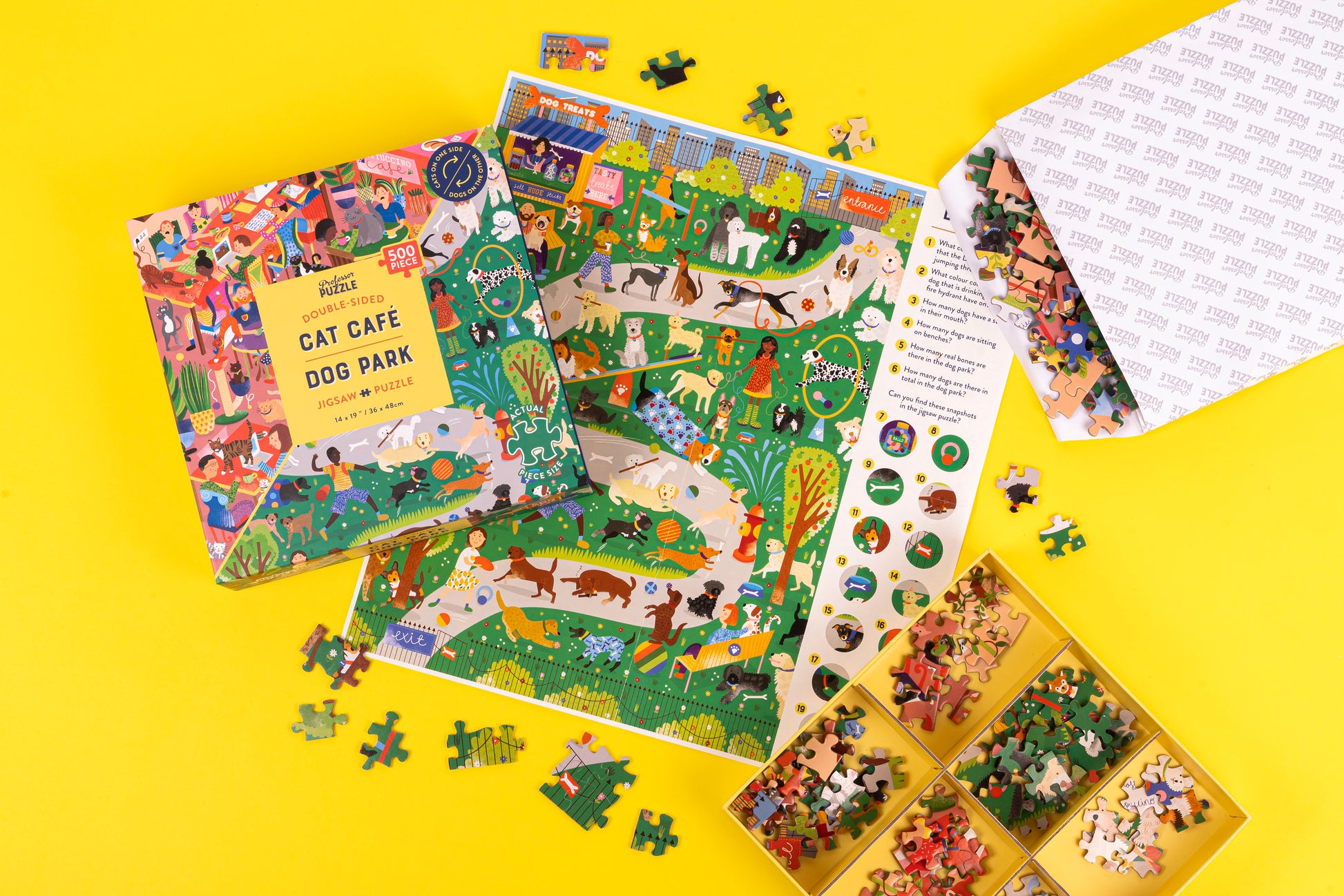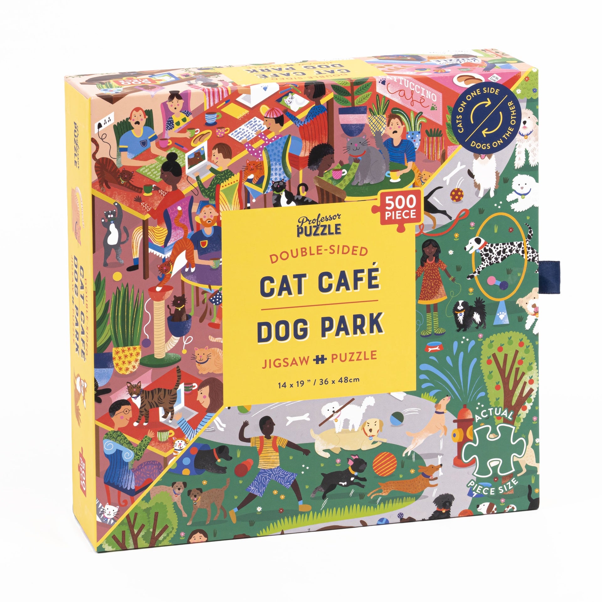 Professor Puzzle's puzzle. Do you like cats or dogs? Now you don't have to choose because this puzzle is double-sided. On one side there is a picture of playful dogs in the park, on the other side a cozy cat cafe.