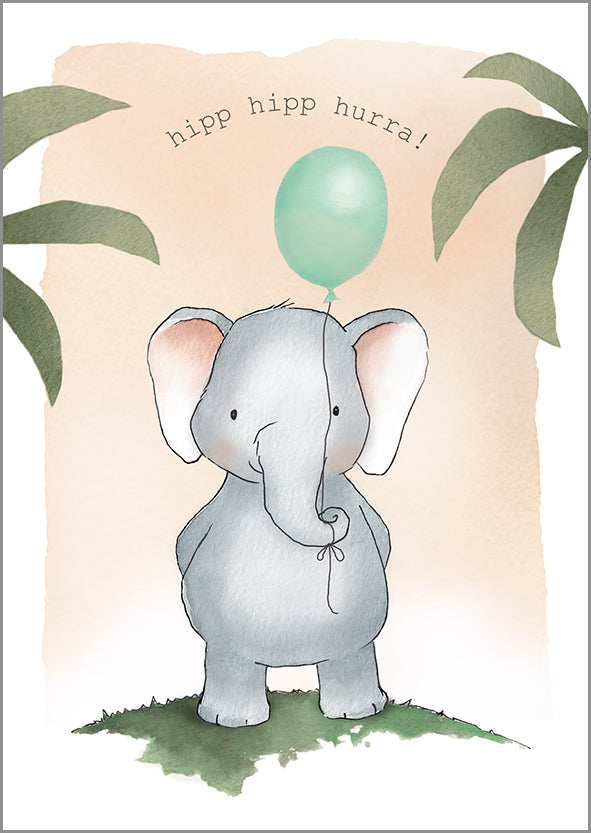 Finnish 1-piece Putinki postcard, high-quality cardboard. The picture shows a cute elephant with a balloon in its trunk and the Swedish text "hipp hipp hurra!". Light orange background. Size 105 x 148 mm. Design: Henna Adel.