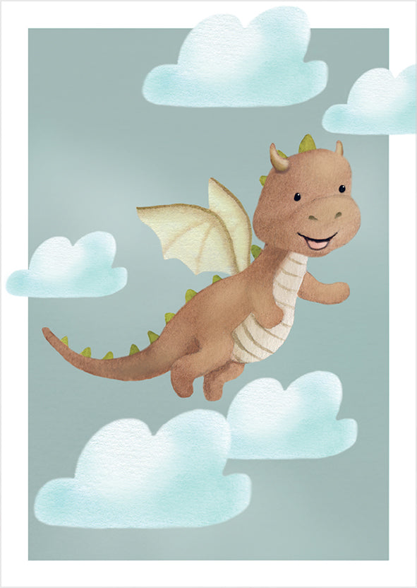 Finnish 1-piece postcard made of high-quality cardboard. The picture shows a cute dragon flying among the clouds on a light gray background. The card is textless on the back. Size 105 x 148 mm. Design: Henna Adel.