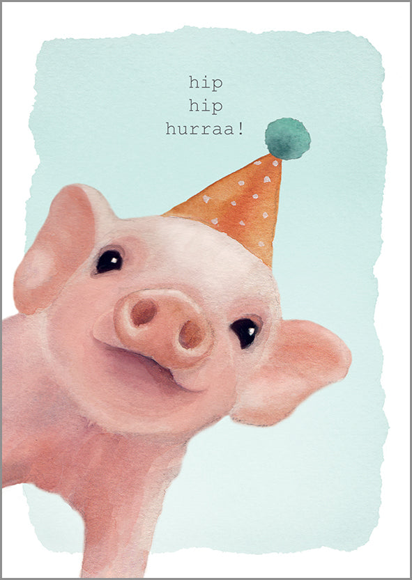Finnish 1-piece Putinki postcard, made of high-quality cardboard. The picture shows a pig wearing a circus hat, a light green background and the text "Hip hip hurraa!" Size 105 x 148 mm. Design: Henna Adel.