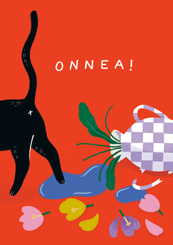 Cat-themed greeting card with the text "Onnea" which means "Congratulations" in finnish language. Blank on the reverse side. Size 105 x 148 mm. Made in Finland. Design: Kaisu Sandberg.