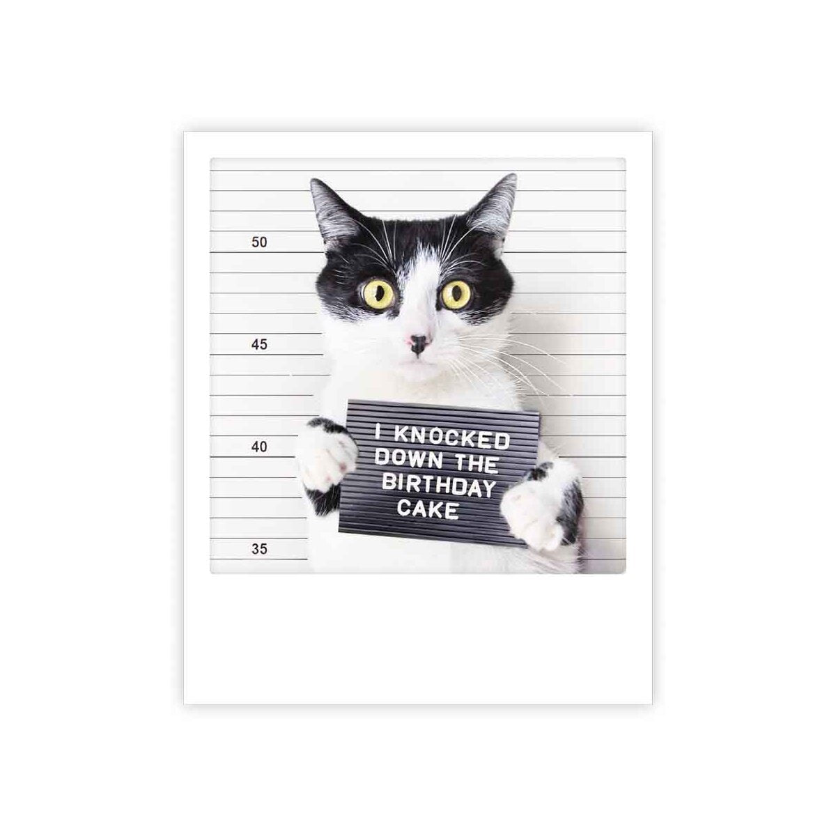 1-piece postcard made of high-quality varnished cardboard. The picture shows a black and white cat with a sign in its paws, the sign has the English text "I knocked down the birthday cake". White measurement chart as a background. Size 105 x 130 mm. Manufacturer: Pickmotion. Printed in Germany.