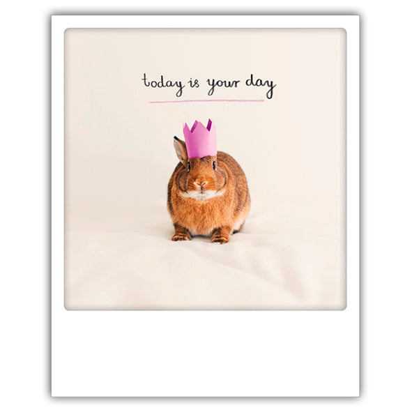 Postcard made of high-quality varnished cardboard. Pictured is a bunny with a pink crown on its head. Text: "Today is your day". Size 105 x 130mm. Manufacturer Pickmotion.