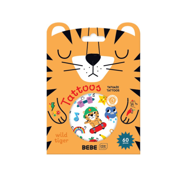 Tattoo pictures for children. 50 stickers in a package, tiger-themed packaging. Sales item includes. Design: Interdruk.
