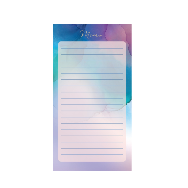 Magnetic notepad with tear-off pages. 52 lined pages, size 10.5 x 19.5 cm. The pages have multi-colored alcohol ink coloring. Design: Putinki Design.