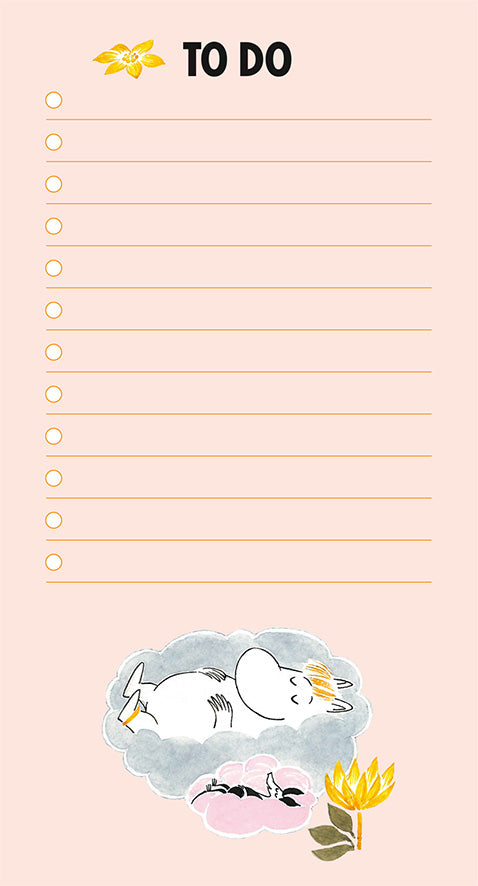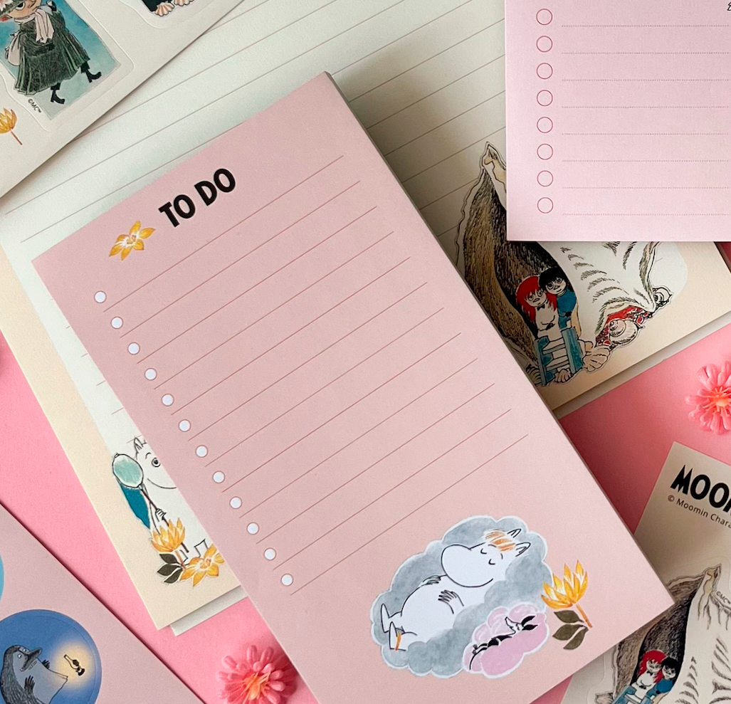 To Do list with Moomin illustrations. The pad is pink, the top reads "To do" and the bottom has a picture of Snorkmaiden lying on a cloud. The pad has 52 tear-off lined pages and a magnet for attaching to the fridge, for example. Paper quality 100 gsm2. Size 10.5 x 19.5 cm. © Moomin Characters™
