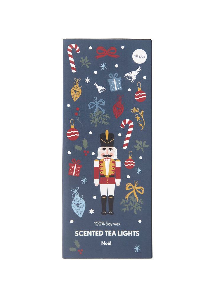 Scented tealight candles. Tealights scented with Christmas spices in a beautiful gift box. The box features candy canes and Christmas tree decorations. 10 tealights, 100% soy wax. Box size 79 x 193 x 15 mm. Design: Pluto Design.