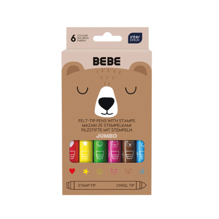 Bebe Friends jumbo markers fit perfectly in a child's hand, with a stamp on one end. The pack contains 6 markers in different colors. Design: Interdruk.