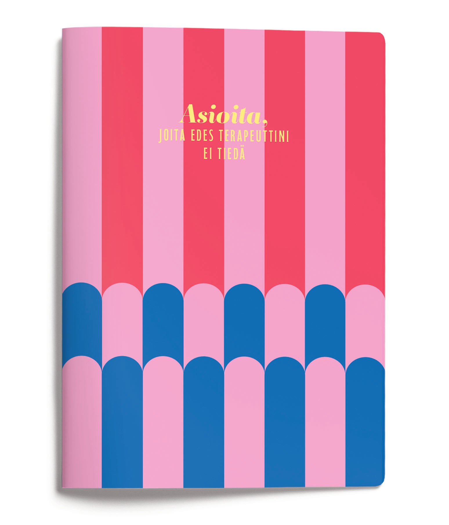 Putingin Pilke-sarjan A4 kokoinen vihko. Mattalaminoitu kansi, jossa on raitakuosi pinkin, punaisen ja sinisen sävyissä, sekä keltaisella teksti "Asioita, joita edes terapeuttini ei tiedä". Vihkossa on värilliset sisäkannet, 56 tyhjää sivua, paperin vahvuus 100 g. Pyöristetyt kulmat. Putinki Design. Tuotteessa on Design from Finland -merkki.